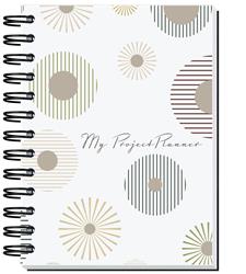 5" x 7" journal with a white 15 pt. front cover, printed full color with protective gloss coating. Back cover is durable thick 50 pt. chipboard in choice of colors, black will be used unless otherwise specified. Includes 80 stock project planning sheets printed on recycled paper with the recycle symbol in the lower right corner. Wire-O bound on left side in black. This planner helps students plan assignments and study timelines, teams track tasks and progress, and builders coordinate milestones, track materials, and schedule site visits.