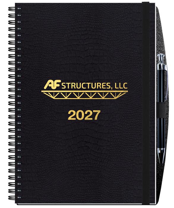 Hybrid 14 month planner and journal in one. Features a sturdy, heavyweight, alligator embossed, front cover foil stamped in one standard color, with pen safe back and free dynamic pen.