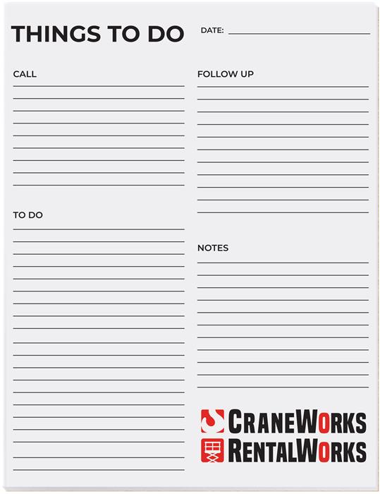 Scratch pad with 25 sheets of 50 lb. white offset paper printed one to four standard colors or four color process and a chipboard back, a perfect desk companion for recording notes. This business necessity will keep your logo and message within arms reach every day. Perfect for any corporate environment, for any service providers, in libraries, government offices, medical offices - truly a promotion with universal applications. Size: 8 3/8" x 10 7/8" Production Time (in working days after final proof approval): 5 Imprint Methods: Printed Imprint Charges: Imprint Area: 7 7/8" x 10 3/8" Packaging: Bulk packed in cartons