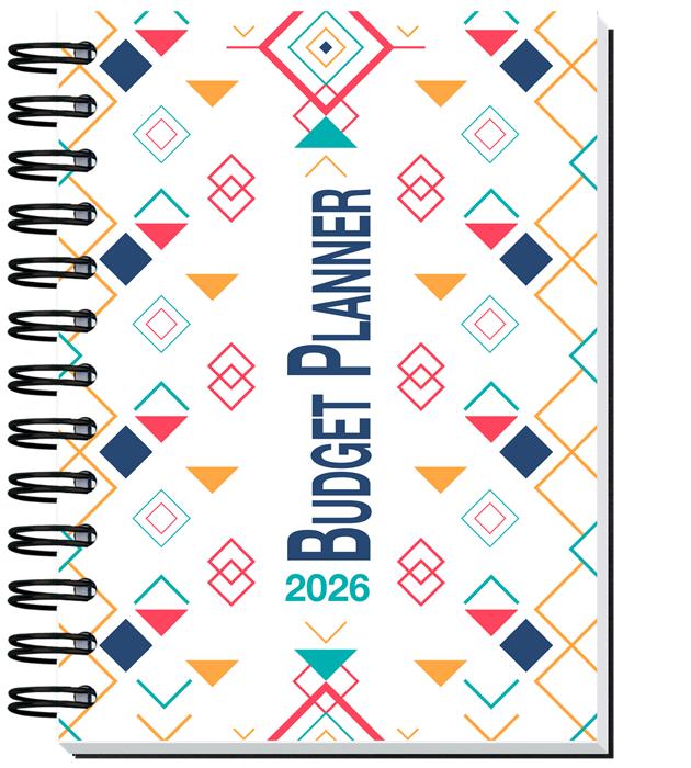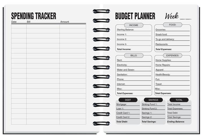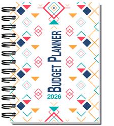 5" x 7" journal with a white 15 pt. front cover, printed full color with protective gloss coating. Back cover is durable thick 50 pt. chipboard in choice of colors, black will be used unless otherwise specified. Stock budget planning sheets. Recycled symbol printed in lower right corner. Wire-O bound on left side in black.