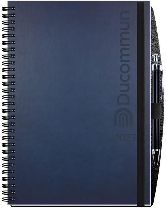 New! Hybrid 14 month planner and journal in one. Features a supple leather-like material bonded to heavyweight board with blind deboss imprint. Pen safe back cover features heavyweight black pen safe back with elastic closure/bookmark and pen loop. Free dynamic pen comes inserted in loop. Monthly calendar view with white offset inside sheets printed gray on two sides. Includes 14 months (December - January) followed by 50 journal sheets printed with light gray rules on both sides. Wire-O bound on left side in Black. Pewter or white upon request. Ideal promo for any profession.Size: 7" x 10" Production Time: 10 working days after final proof approval. Imprint Methods: Blind DebossImprint Charges: Plate Charge $65 (V)/Foil Color Imprint Area: 18 sq in. Packaging: Shrink-wrapped 5 per package.
