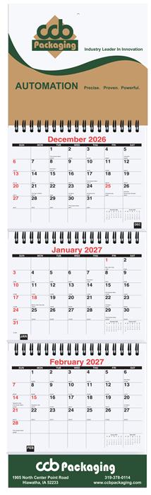 Size 6" x 20 3/4" December - January wall calendar (14 months) Custom imprint, featured on the top header and bottom apron, is printed one to full color on white coated stock. Tearing off calendar sheets allows three months to be visible at one time. A simple promotional idea that will reap benefits year-round! Calendar is printed in black & red ink on white offset and includes American holidays, moon phases, and Julian dates. Pad is wire-O bound into board.
