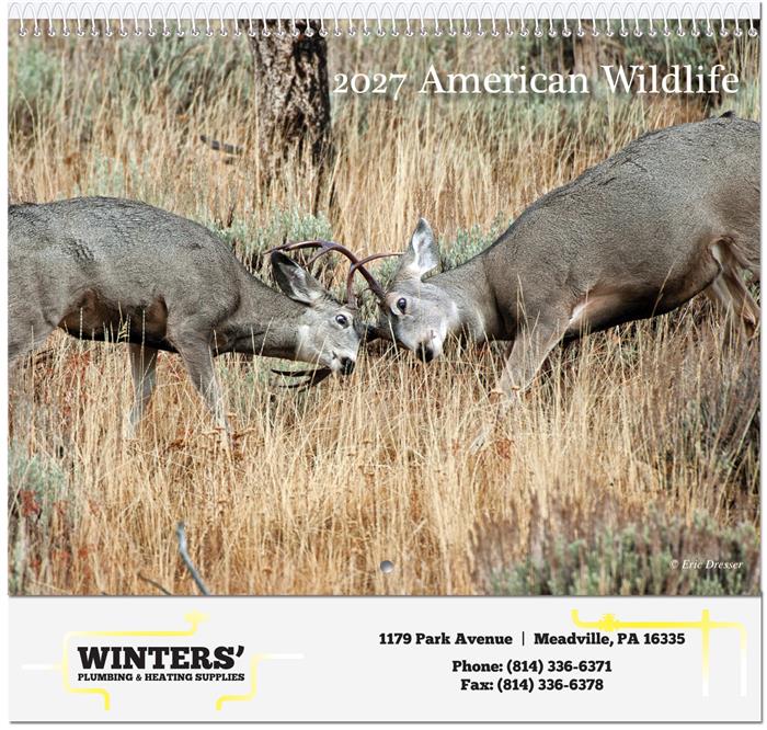 12 month wall calendar featuring photos of animals and birds found in the beautiful American outdoors. Stapled.