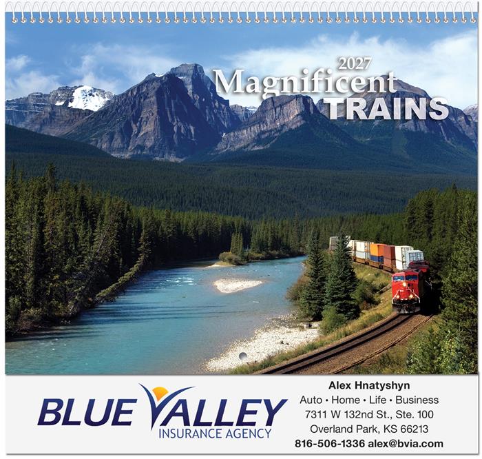 Beautiful monthly wall calendar features 12 interesting photos of locomotives and railroad trains printed on 12 sheets of 80 lb. gloss text. Calendar is printed in black and red with 80 lb. gloss front and back covers and full color photographs. Company logo/tagline imprinted in full color on bottom of back sheet. This January-December calendar includes American holidays, moon phases and Julian dates. Last sheet features 2 years on a page. Hole at top for hanging. Coil binding.